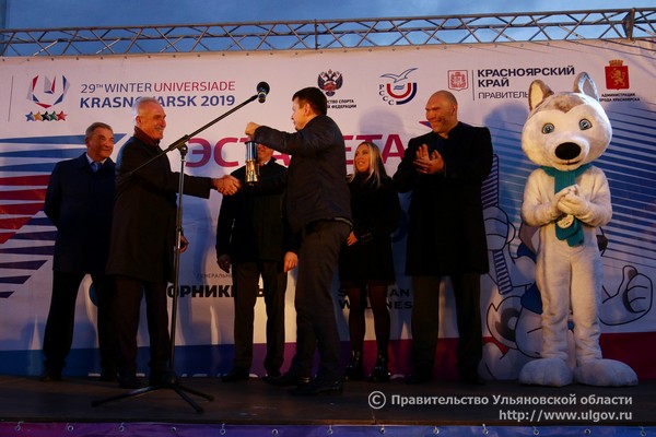Огонь Зимней универсиады-2019 встретили на площади перед Дворцом спорта «Волга-Спорт-Арена», куда транспортировочную колбу с пламенем доставила автоколонна во главе с байкерами клубов «Ночные волки», «Стальные крылья» и «Свобода». В торжественном мероприятии приняли участие Министр спорта Российской Федерации Павел Колобков, Губернатор Ульяновской области Сергей Морозов, руководитель Дирекции Зимней универсиады-2019 Максим Уразов, двукратная олимпийская чемпионка по легкой атлетике, посол Студенческих игр, двукратная олимпийская чемпионка Светлана Мастеркова, депутат Государственной думы, президент Федерации хоккея России Владислав Третьяк, депутат Государственной думы, первый заместитель председателя комитета ГД по экологии и охране окружающей среды Николай Валуев.