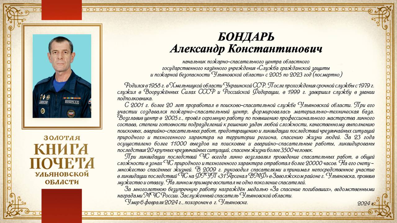 начальник пожарно-спасательного центра областного государственного казённого учреждения «Служба гражданской защиты и пожарной безопасности Ульяновской области» с 2005 по 2023 год (посмертно)